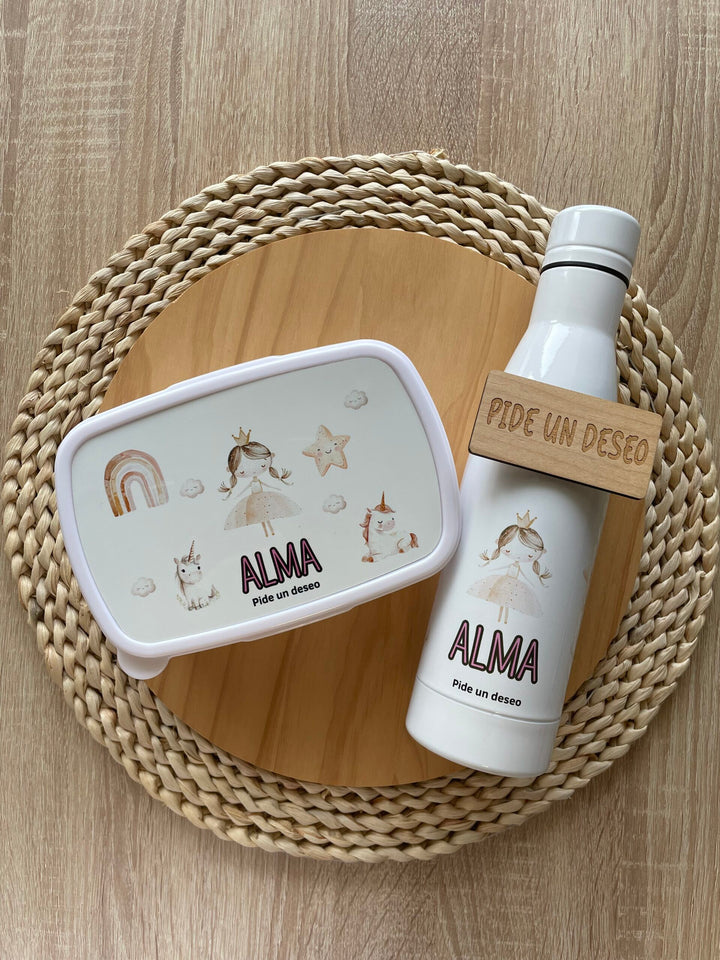 Este práctico pack incluye una botella termo y una fiambrera rígida, ambos disponibles en diferentes diseños. Puedes personalizarlos con el nombre del niño o la niña, haciendo que cada día sea aún más especial.