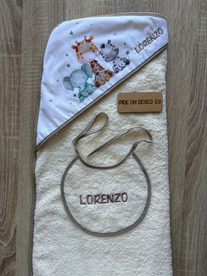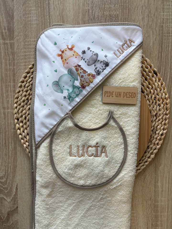 Este set compuesto por una capa de baño de tamaño maxi (100x100 cm) y un práctico babero, es el regalo ideal para cuidar al bebé con suavidad y estilo desde el primer día.