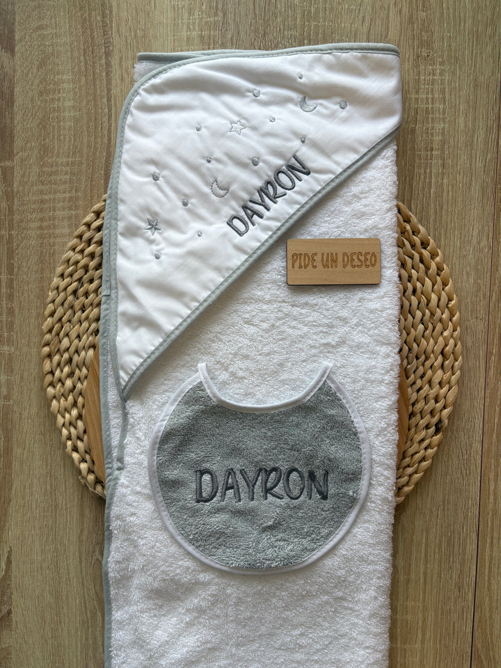 Este set compuesto por una capa de baño de tamaño maxi (100x100 cm) y un práctico babero, es el regalo ideal para cuidar al bebé con suavidad y estilo desde el primer día.