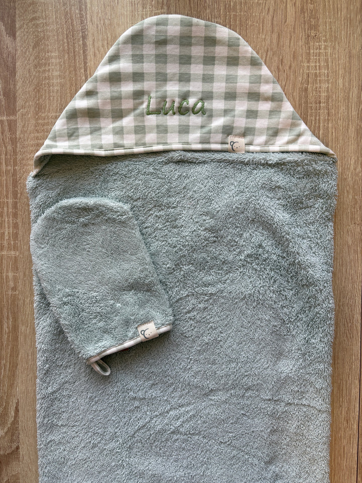 Capa de baño vichy personalizada y manopla para Bebé con Nombre Bordado – 100% algodón