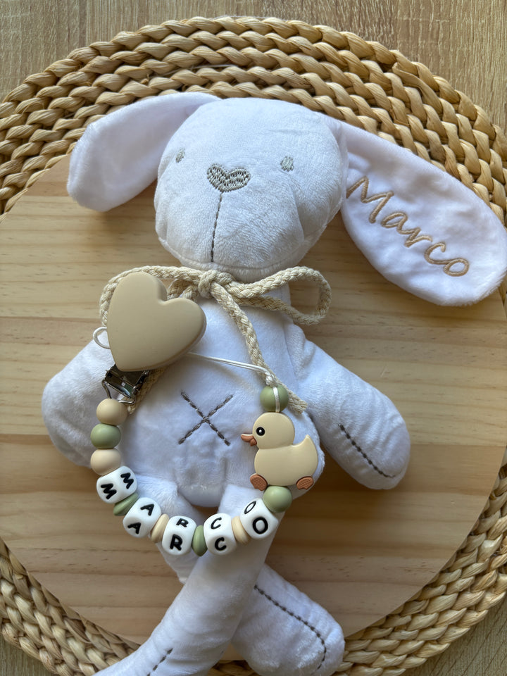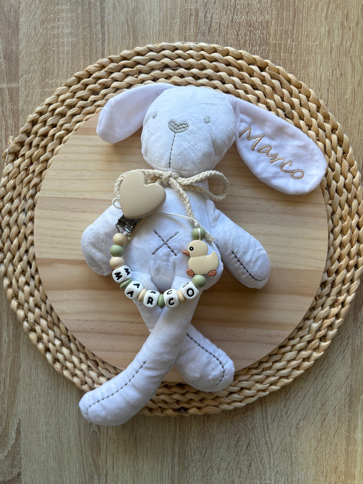 Muñeco de apego con cordón de algodón en color beige y nombre personalizado. Será su primer muñeco de apego, para que los bebés estén en calma cuando no está cerca de sus seres queridos.. Crean un vinculo emocional que ayudan al bebé a tranquilizarse y dormir mejor cuando está inquieto/a. Puedes tenerlo cerca de tí un tiempo, para que reconozca tu olor y le tranquilice a la hora de dormir. Chupetero con corona en colores blanco y gris. El modelo personalizado expuesto en la foto puede ser ligeramente rediseñado en cuanto a tamaño o número de piezas. Esto es debido a que no todos los nombres poseen el mismo número de letras. Además en ocasiones hay que adaptar ligeramente los modelos con la finalidad de poder cumplir con las exigencias legales actuales que nos marcan una longitud máxima por seguridad para el bebé. El máximo de letras posibles son 9. – Tildes no disponibles. Tenemos letra Ñ. Nuestros chupeteros y mordedores están realizados con piezas de silicona antibacteriana de grado alimentario libre de BPA, ftalatos, cadmio y plomo. Trabajamos siempre con materiales de máxima calidad y garantía, cumpliendo la normativa de seguridad europea DIN EN 71-3 y, por tanto, satisfacen las exigencias legales. – Desechar al primer indicio de deterioro o de desperfecto. No manipular nunca ya que perdería la seguridad con la que están realizados. – No hervir. No esterilizar. – Lavar a mano con agua y jabón neutro. – Esta cadena debe usarse siempre bajo vigilancia de un adulto. – Fijar el clip únicamente a la ropa fina del bebé.