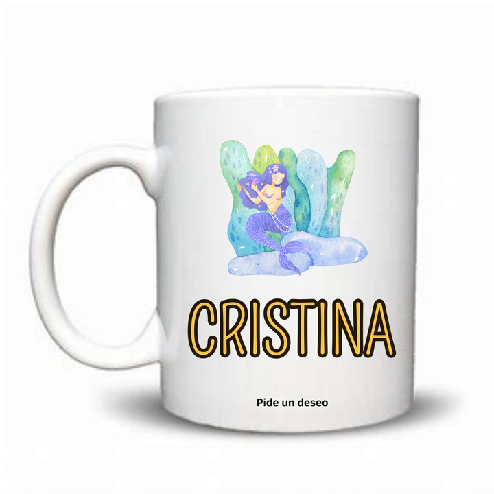 Taza de cerámica de 350 ml de capacidad, de color blanco con acabado brillo.